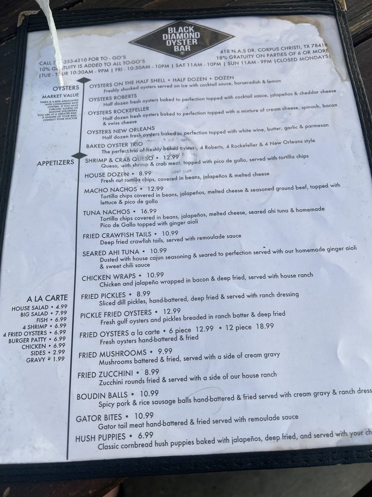 Welcome to Black Diamond Oyster Bar, a delightful blend of seafood and American cuisine right in Corpus Christi. Nestled at 418 Nas Dr, this casual hotspot offers a diverse menu perfect for lunch or dinner. Known for its fresh oysters, many patrons rave about the Ahi Tuna Nachos, a must-try that elevates typical bar fare to something extraordinary.